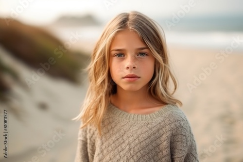 Portrait of a cute little girl with blond hair looking at camera on the beach