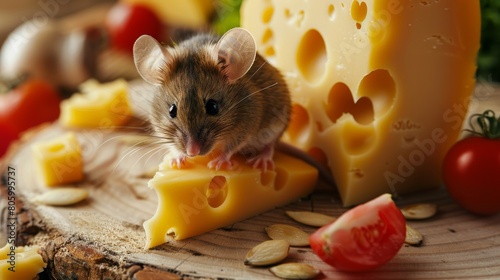 Portrait of a cute little mouse with emmental cheese on a wooden table.