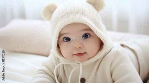 portrait of a cute smiling baby. Cute baby in bed on his stomach with his head up looking with his big eyes. Warm and soft beige clothing. Close up.