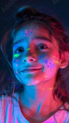 Portrait of a cute, smiling girl with paint painted on her face. Have fun playing shots.