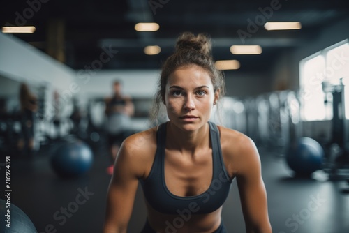 Portrait of a determined girl in her 30s doing medicine ball exercises in a gym. With generative AI technology