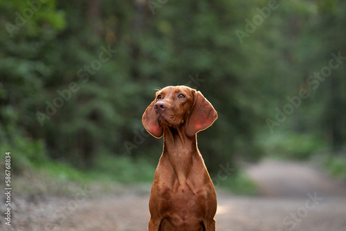 Portrait of a dog on a green background outdoors. Beautiful Hungarian vizsla in nature