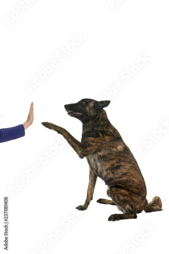 Portrait of a Dutch Shepherd dog, brindle coloring, isolated on a white background seen from aside doing a high five