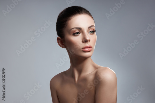Portrait of a fashion woman with a bunch of hair. Perfect face profile girl, natural cosmetics for face care