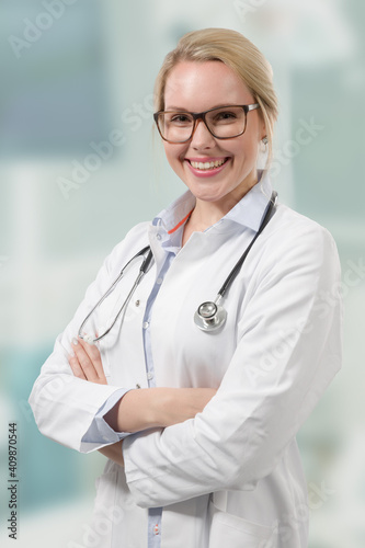 portrait of a female family doctor in docotor's overall
