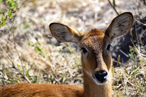 Portrait of a female Southern Lechwe, Kobus leche, in a thick bush bush, Botswana