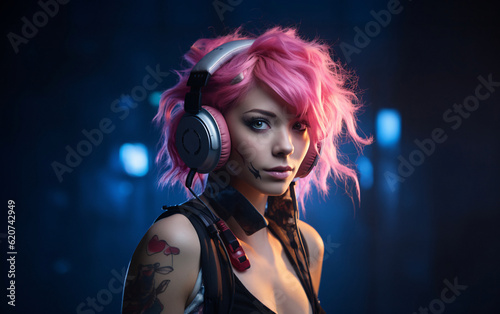 Portrait of a gamer girl with pink hair and large headphones on an abstract blue background