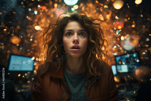 portrait, stressed, girl, surrounded, television, screen, news, anxiety, overwhelmed, information, media, distress, frustration, panic, disarray, tension, desperation, concern, fear, chaos, unsettled, apprehension, worried, agitation, disturbed, pressure