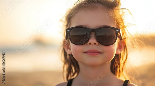 Portrait of a girl wearing sunglasses, smiling on the beach with a clear sky in the background, showing off her beauty, style and summer glamour