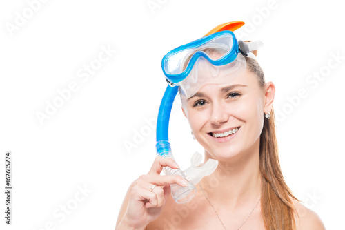 Portrait of a girl with a mask for diving on a white background