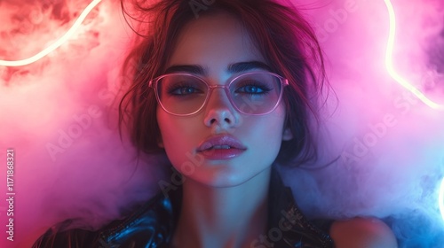 portrait of a girl with glasses in neon lights