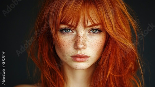 Portrait of a girl with striking red hair, captivating blue eyes, and a sprinkle of freckles across her expressive face against a dark background.