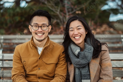 Portrait of a grinning asian couple in their 30s sitting on bench