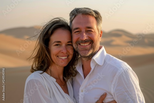 Portrait of a grinning couple in their 40s wearing a classic white shirt isolated on serene dune landscape background