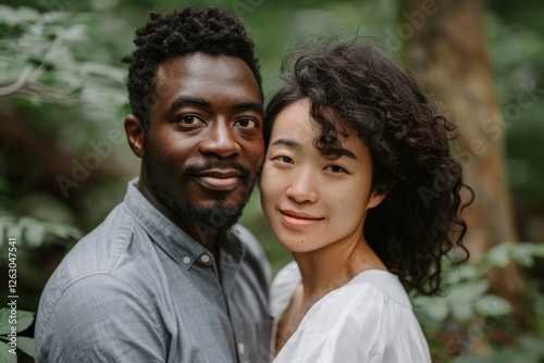 Portrait of a grinning multiethnic couple in their 30s looking at the camera
