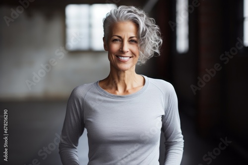 Portrait of a grinning woman in her 50s showing off a lightweight base layer against a empty modern loft background. AI Generation