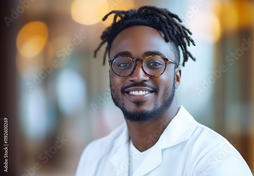 young, male, black, goggles, labcoat, white, short hair, curly, smiling, confident, friendly, portrait, indoor, background, blurry, office, laboratory, face, feature, eye, nose, mouth, clear, window, tree, building, view, professional, positive, atmosphere, standing, man, person, smart, intelligent, youthful, energy, vitality, focused, demeanor
