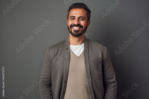 Portrait of a handsome bearded Indian man smiling at the camera while standing against grey background