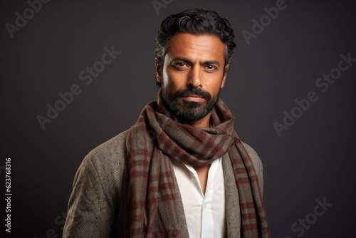 Portrait of a handsome bearded Indian man wearing a scarf over grey background