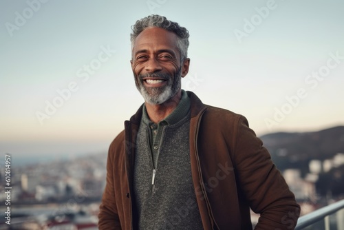 Portrait of a handsome mature man looking at camera and smiling while standing outdoors