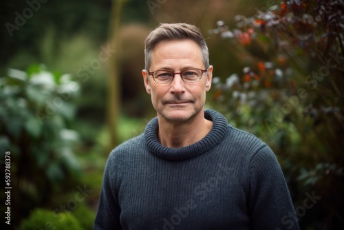 photo, portrait, environmental, expression, emotion, satisfied, adult, 40s, man, male, comfort, fall, snug, season, comfy, outerwear, style, garment, cosy, cosiness, autumn, layer, cable, pullover, flower, horticulture, nature, gardening, greenery, botanical, background, landscape, outdoors, plant