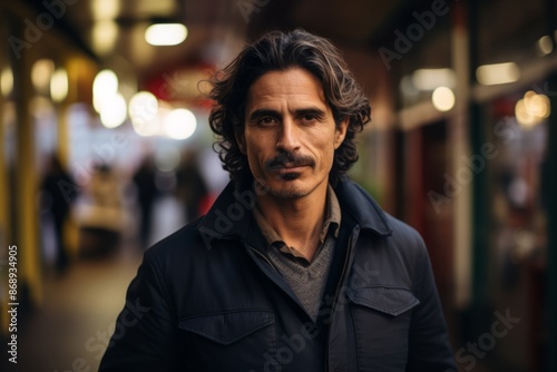 Portrait of a handsome middle aged man with long curly hair, wearing a blue jacket, standing in the city at night.
