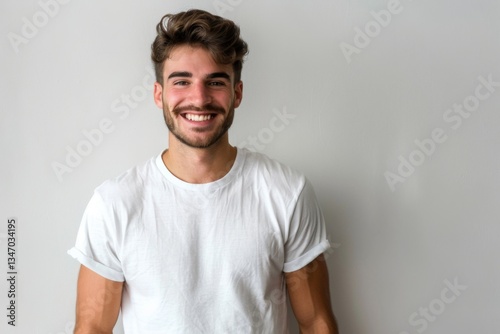 people, portrait, photogenic, young, man, male, smile, white, t-shirt, standing, background, confidence, happy, cheerful, joy, positive, expression, attractive, casual attire, fashion, style, modern, minimalist, simplicity, fresh, clean, trendy, self-assured, friendly, relaxed, optimistic, approachable, youthful, energy, vibrant, charming, contemporary, person, isolated, studio, model, individual, beauty, lifestyle, bright, healthy, natural, charismatic, lifestyle