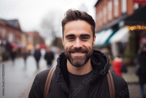 Portrait of a handsome young man smiling at the camera in the street
