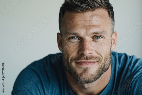 Portrait of a handsome young man with a smile, wearing a blue t-shirt, set against a gray background in a close-up shot
