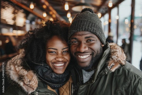 Portrait of a happy afro-american couple in their 30s wearing a warm parka isolated on serene coffee shop background