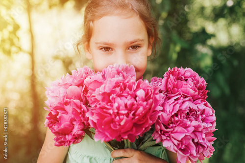 portrait of a happy cute little caucasian seven year old kid girl, holds in hands and smell and enjoying a bouquet of pink peony flowers in full bloom on the background of nature. flare