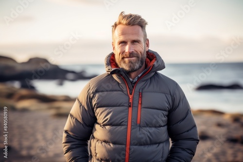 Portrait of a happy man in his 40s sporting a quilted insulated jacket in sandy beach background