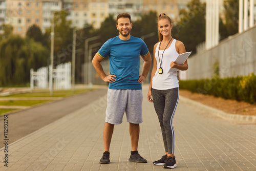 Portrait of a happy sporty couple in sportswear with stopwatch standing after sport jogging exercises in city park and looking cheerful at camera. Outdoors training and fitness in nature concept.