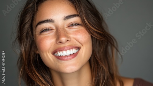 Portrait of a Happy Woman with a Radiant Smile and Freckles A Close-up Shot Highlighting her Beautiful Features and Brown Hair