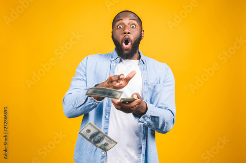 Portrait of a happy young afro american man throwing out money banknotes isolated over yellow background.