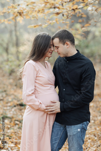 portrait of a happy young family, husband and pregnant wife, standing against the background of beautiful light in the autumn forest, looking at each other