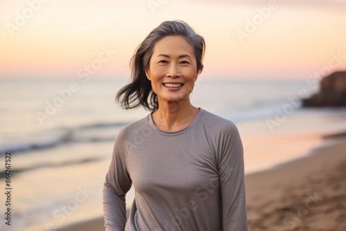 Portrait of a joyful asian woman in her 50s showing off a lightweight base layer isolated in beautiful beach sunset