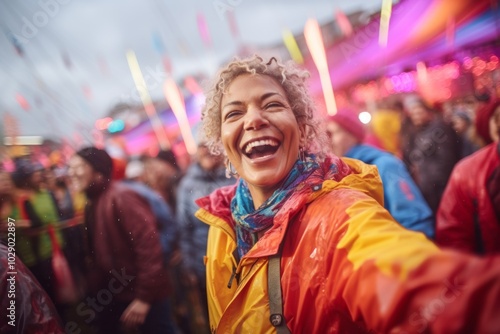Portrait of a joyful woman in her 40s dressed in a water-resistant gilet isolated in vibrant festival crowd
