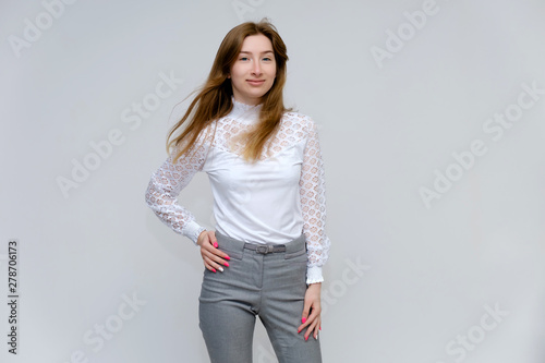 Portrait of a knee-high young pretty brunette girl woman with beautiful long hair on a white background in a white jacket and gray pants. He talks, shows his hands with emotions in various poses.