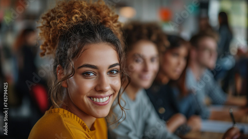Portrait of a latin spanish student girl with curls smiling and looking at the camera. AI generated