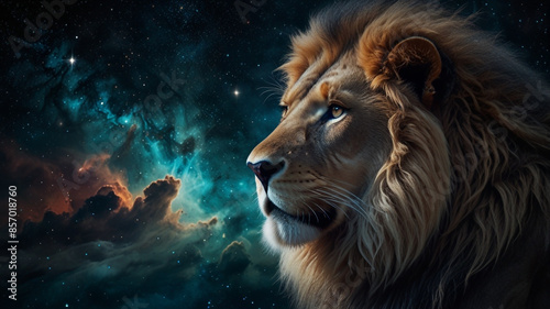 cosmic, image, romanticism, huge, lion, feature, resplendent, star, galaxy, mane, aethereal, cosmos, texture, iridescent, color palette, intricate, glowing, motif, intensity, detailed, science fiction, artistic, high contrast, moody, atmosphere, celestial, majestic, stellar, predator, nature, wildlife, animal, mammal, strong, cat, portrait