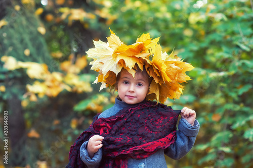 Portrait of a little girl in a wreath of autumn leaves . Children on a walk in the autumn Park