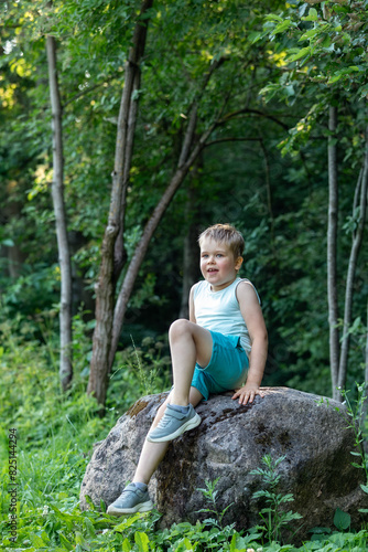Portrait of a lively cute boy sitting on a stone on a beautiful green background of trees