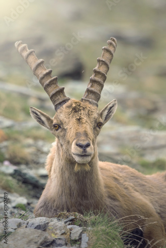 Portrait of a male alpine ibex (Capra ibex) with long horns, looking at camera and resting in his typical mountain environment against soft background. high altitude animal. Italian Alps, Piedmont.