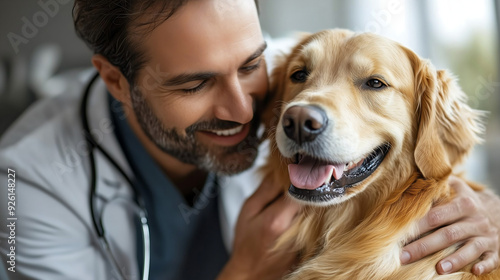 Portrait of a male doctor petting a happy golden retriever dog in a clinic