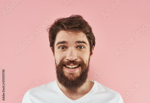 Portrait of a man in a white T-shirt on a pink background close-up model