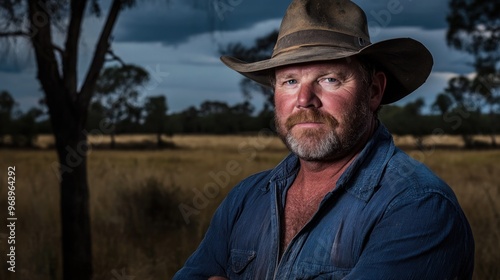 man, portrait, cowboy, hat, field, brown, blue, shirt, weathered, worn, rugged, rustic, beard, moustache, hair, face, eye, skin, outdoors, nature, background, sky, tree, landscape, country, rural, farm, ranch, grass, sunset, shadow, light, mood, expression, thoughtful, serious, gaze, sharpened, detail, texture, grain