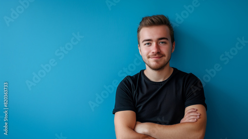 portrait, man, black, shirt, standing, blue, wall, photo, stock, image, male, background, casual attire, person, fashion, adult, isolated, studio, expression, serious, pose, modern, stylish, urban, clean, minimal, colourful, professional, cool, confident, vibrant, photogenic, guy, boy, people, face, smiling, model, man, smile, t-shirt, 1, looking, hair, lifestyle, beard, arm, youth