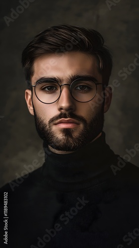 Portrait of a man in early adulthood with a contemplative expression and stylish glasses