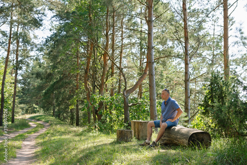 Portrait of a man in the forest. The traveler stopped to rest and sat down by the road